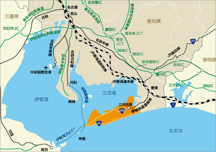 また、中部地方の中でも特に温暖な気候で過ごしやすい地域です。サーフィンで有名な大石海岸(太平洋ロングビーチ)や、「日本の灯台50選」にも選ばれた灯台がある伊良湖岬などの観光名所にもあふれており、毎年たくさんの観光客が訪れます。